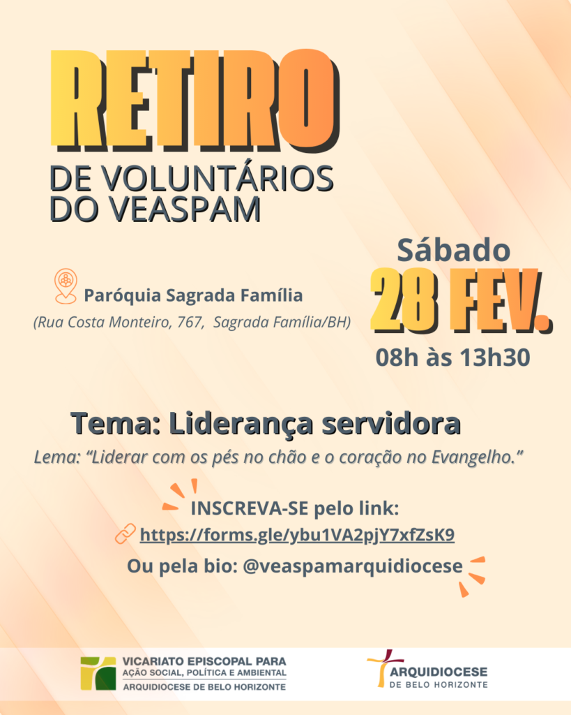 Estão abertas as inscrições para o Retiro de Voluntários do Vicariato Episcopal para Ação Social, Política e Ambiental (Veaspam) da nossa Arquidiocese. O Encontro será realizado no dia 28 de fevereiro (sábado), das 8h às 13h30, na Paróquia Sagrada Família (Rua Costa Monteiro, 767 – Sagrada Família, BH).