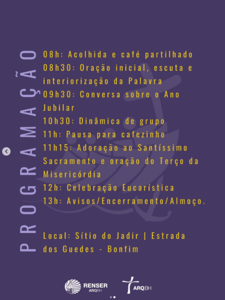 A manhã de oração, espiritualidade e comunhão será inspirada pelo tema “O Ano Jubilar e a catequese”. A programação convida os participantes para momentos de reflexões, Adoração ao Santíssimo, Oração do Terço da Misericórdia, dinâmica de grupo e Celebração Eucarística. O encontro será realizado no Sítio do Jadir – Estrada dos Guedes – Bonfim.