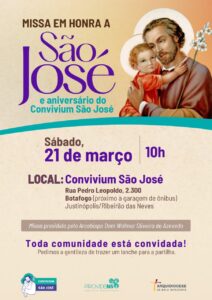 Para celebrar os 5 anos do Convivium São José, em Ribeirão das Neves, será celebrada a Santa Missa, neste sábado, 21 de março, às 10h. Toda a comunidade está convidada a participar desse momento especial.