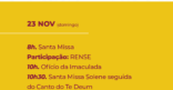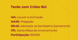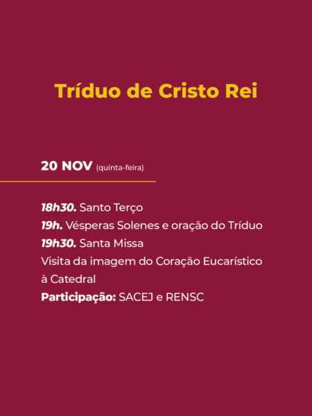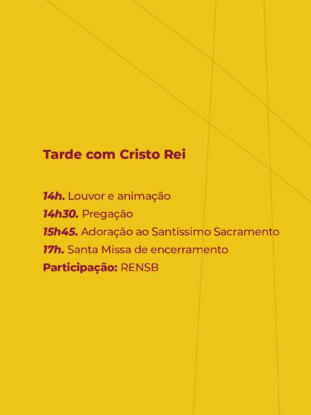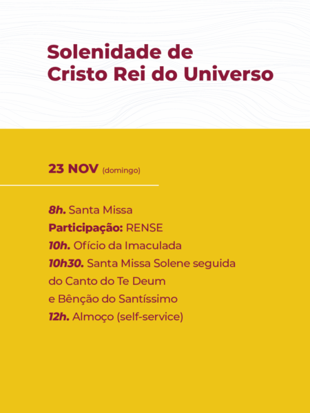 A Missa Solene será celebrada no domingo, 23 de novembro, às 10h30. Este ano, vamos refletir sobre o tema: “Do Trono da Cruz nasce a nossa Esperança”. Convide sua família e venha participar conosco desse importante momento. Vamos juntos dar graças a Cristo Rei!