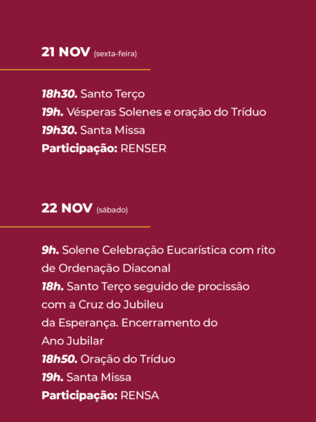 A especial programação inclui Missas, Oração do Terço, Vésperas, procissão com a Cruz do Jubileu da Esperança, Ordenação Diaconal, além da “Tarde com Cristo Rei”: louvor, animação, pregação e Adoração ao Santíssimo.