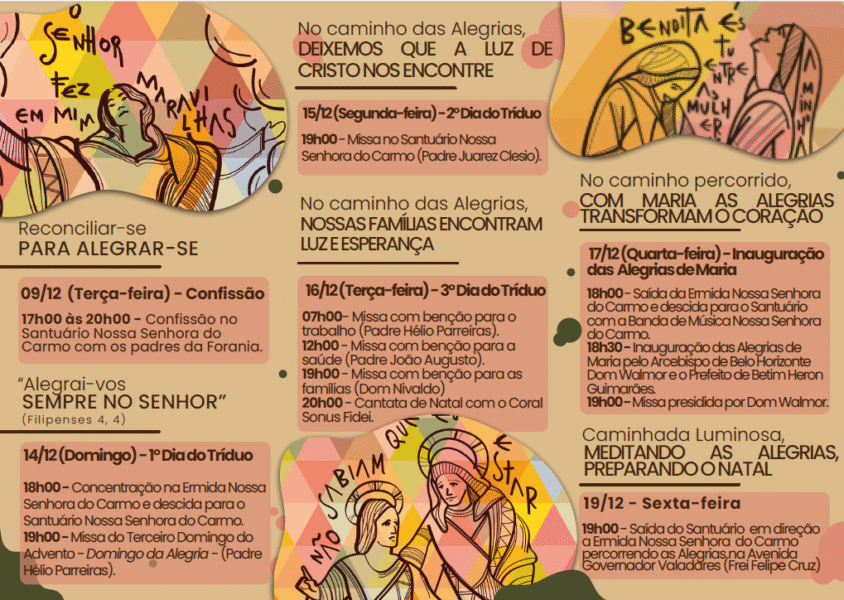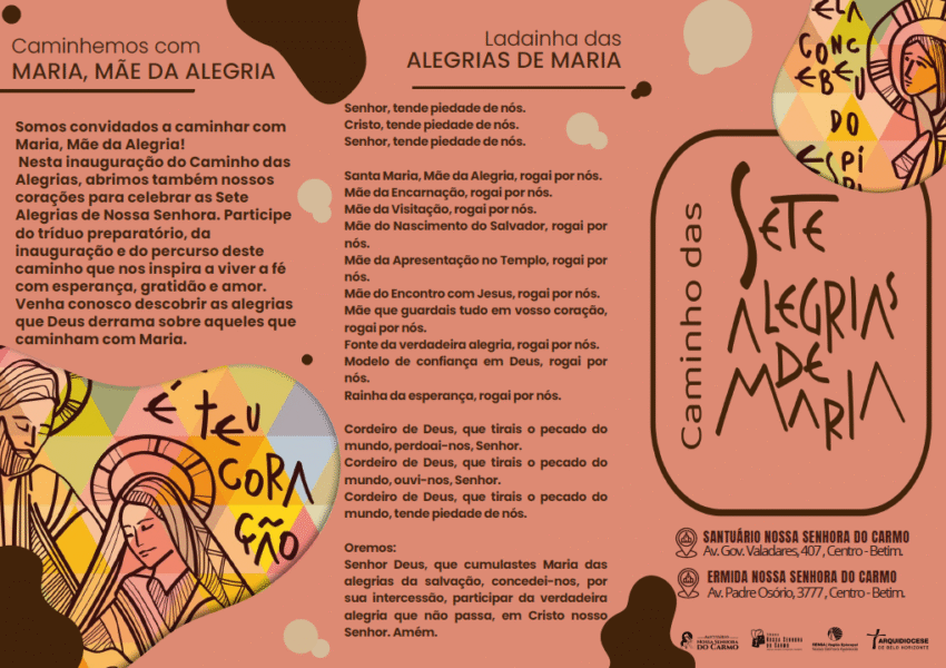 O Santuário Arquidiocesano Nossa Senhora do Carmo, em Betim, convida todos os fiéis a participarem de um momento muito especial: a Missa de inauguração do Caminho das Sete Alegrias de Nossa Senhora, na quarta-feira, 17 de dezembro de 2025, às 19h. A celebração, marcada por profunda devoção mariana, será presidida pelo arcebispo metropolitano de Belo Horizonte, dom Walmor Oliveira de Azevedo.