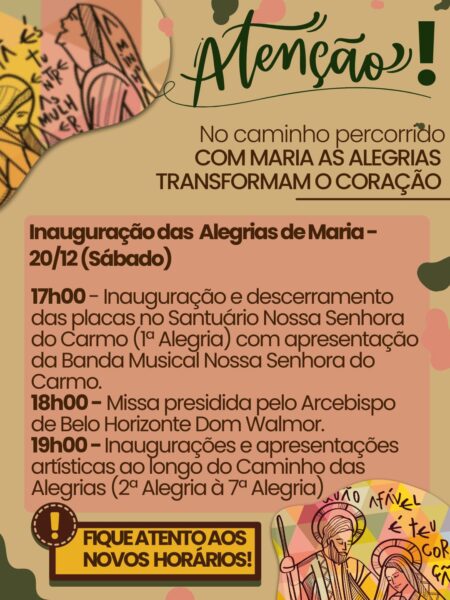 O Santuário Arquidiocesano Nossa Senhora do Carmo, em Betim, convida todos os fiéis a participarem de um momento muito especial: a Missa de inauguração do Caminho das Sete Alegrias de Nossa Senhora, neste sábado, 20 de dezembro de 2025, às 18h. A celebração, marcada por profunda devoção mariana, será presidida pelo arcebispo metropolitano de Belo Horizonte, dom Walmor Oliveira de Azevedo.