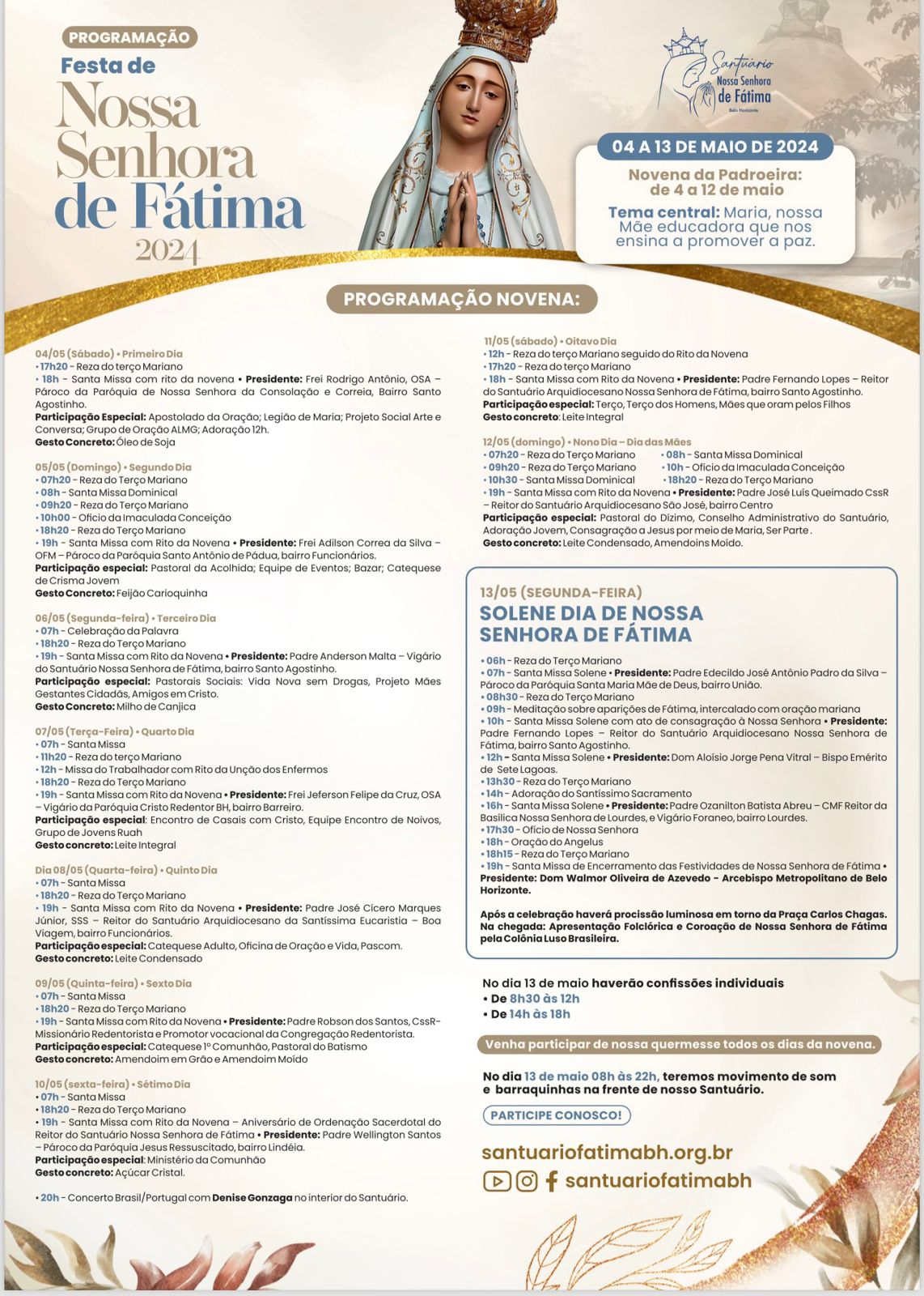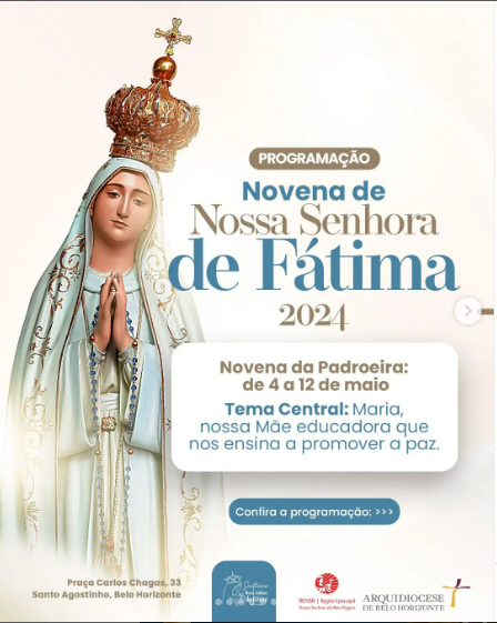 No dia 13 de maio, a Igreja celebra a Festa de Nossa Senhora de Fátima. O Santuário Arquidiocesano Nossa Senhora de Fátima, no bairro Santo Agostinho, preparou uma novena com o tema: “Maria, nossa Mãe educadora que nos ensina a promover a paz” e programação especial que inclui Celebração Eucarística e oração do Terço Mariano todos os dias, a partir do dia 4 de maio (próximo sábado).