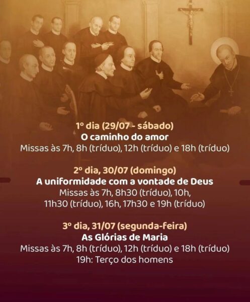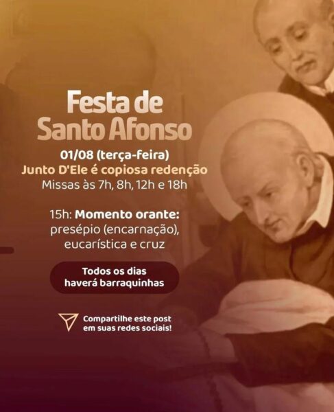 O Santuário Arquidiocesano São José celebra o Tríduo e Festa em honra a Santo Afonso Ligório, fundador da Congregação dos Redentoristas. O tríduo terá início neste sábado, 29 de julho, seguindo no domingo, 30, até a segunda-feira, 31 de julho. A Festa de Santo Afonso será celebrada na terça-feira, primeiro de agosto, com Missas às 7h, 8h, 12h e 18h.