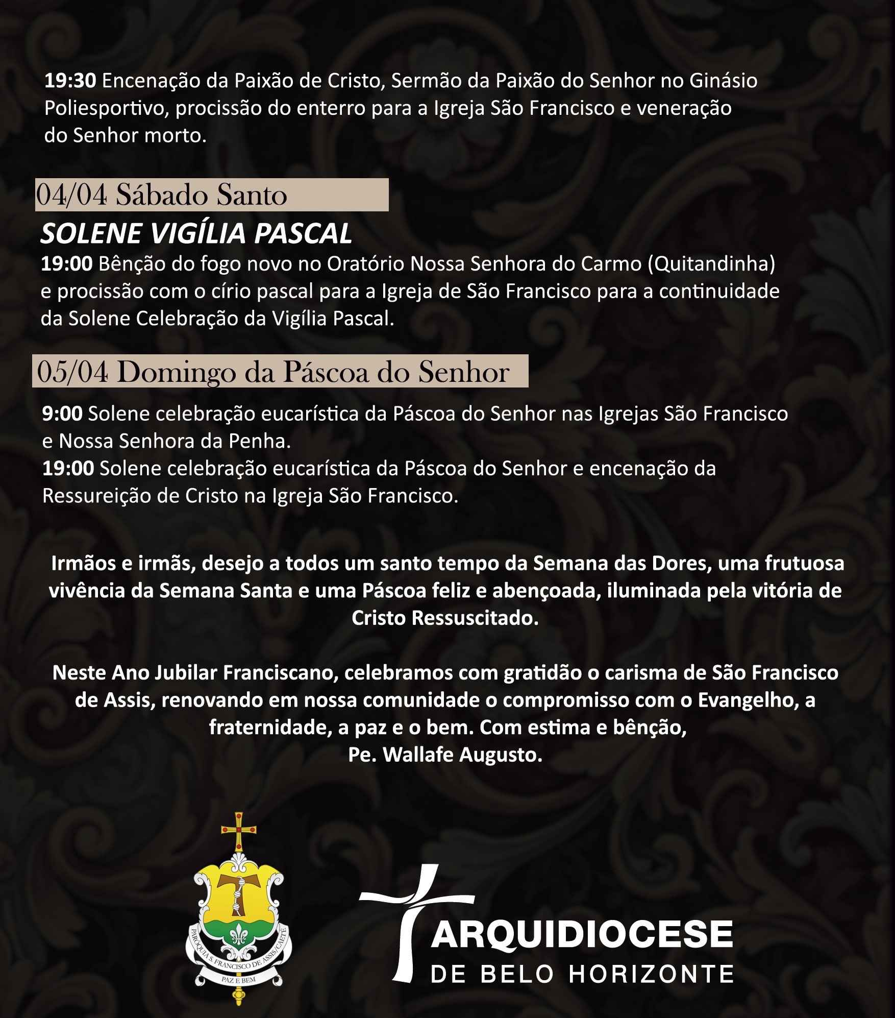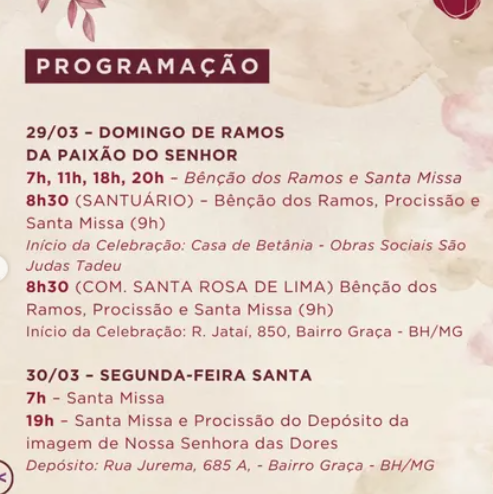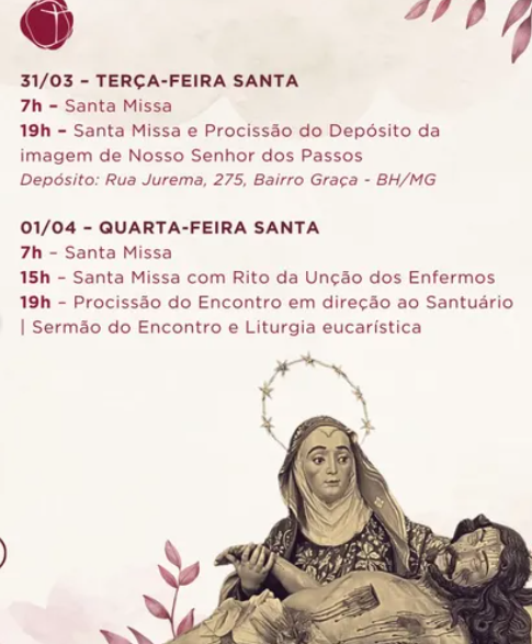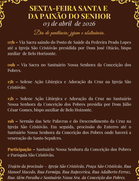 19:30 – Celebração Eucarística na Comunidade Santa Cruz e Procissão com o Senhor dos Passos para Praça do Bairro Fátima. Praça Coração de Maria Av. Arthur Trindade Nossa Senhor de Fatima Betim)