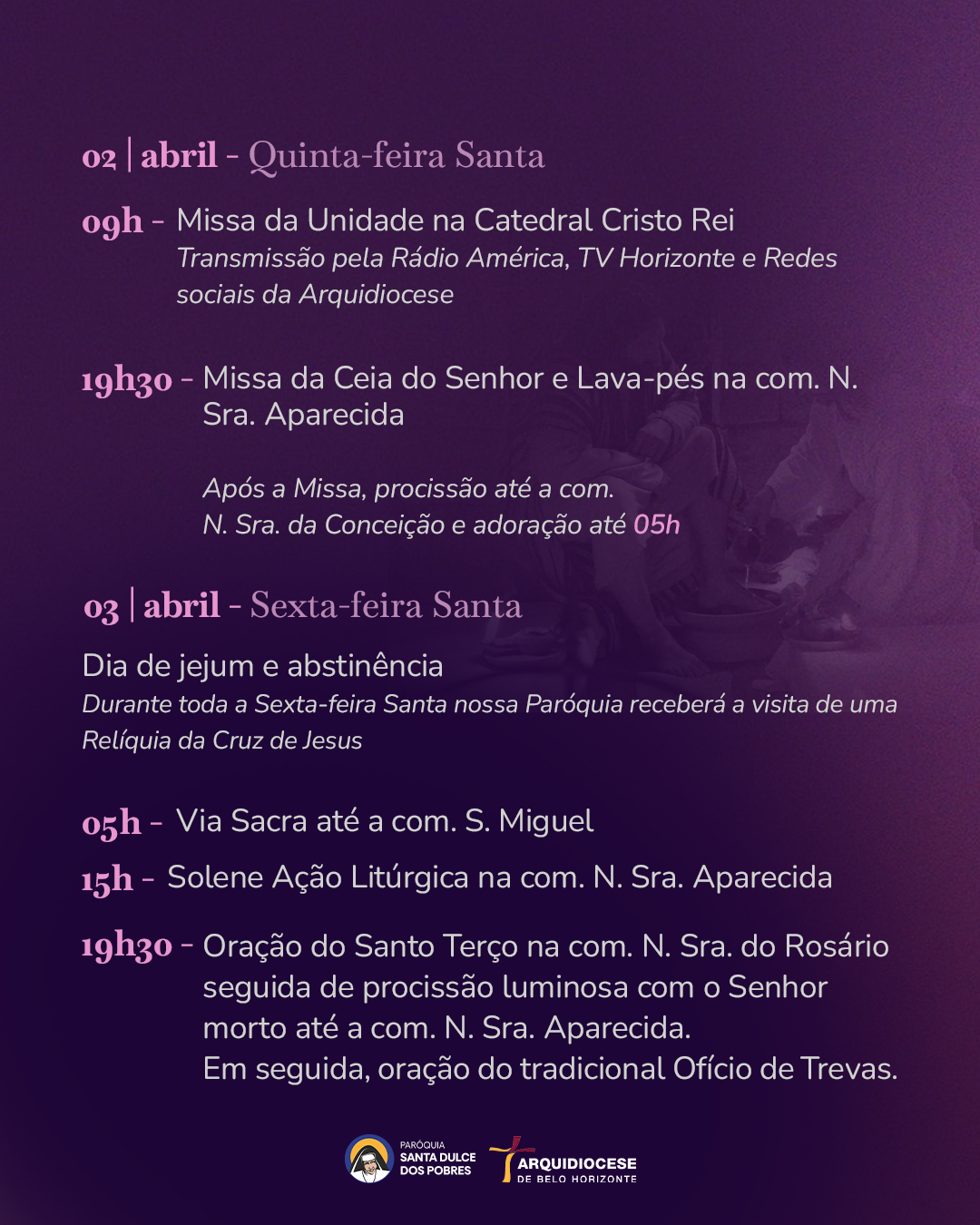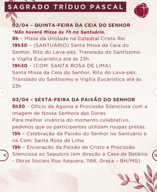Na Segunda, Terça e Quarta-feira Santa as Celebrações serão às 19h, com Mediação das Palavras de Deus. Na Quinta-feira Santa, 2 de abril, a programação inclui a Missa da Unidade, às 9h, Retiro espiritual, às 14h30, e a Missa da Ceia do Senhor, às 19h.