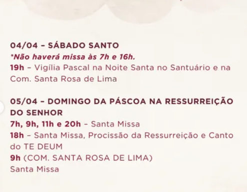 Na Sexta-feira Santa (3/4), os fiéis são convidados para a Via-Sacra, às 9h, pelas ruas próximas à Catedral, e para a Ação Litúrgica, às 15h. No Sábado Santo, haverá Retiro Espiritual, às 14h30, e a Solene Vigília Pascal será celebrada às 19h. Já no Domingo de Páscoa, 5 de abril, a Santa Missa será às 8h, às 10h30 e às 17h. Às 14h30, os fiéis poderão vivenciar o Retiro Espiritual com Mediação da Palavra de Deus e Adoração e Benção do Santíssimo Sacramento