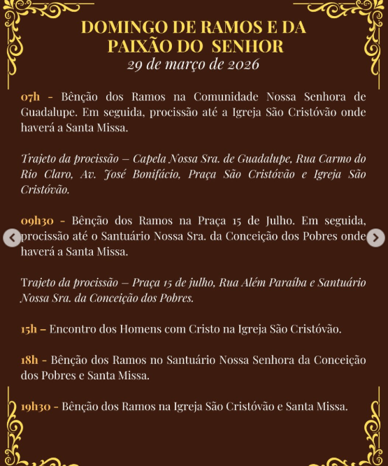 7h e 16h. Missas com bênção dos ramos dentro do Santuário.