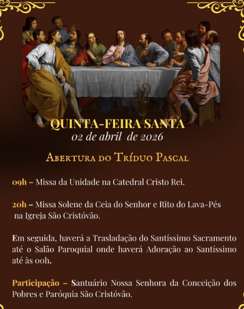 2/04/2026 QUINTA FEIRA SANTA “Todas as vezes que comerdes deste pão e beberdes deste cálice, proclamamos a morte do Senhor.” Cor 11,26