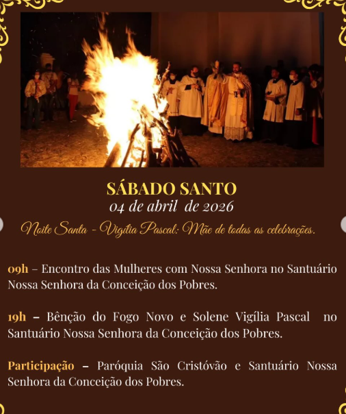 19:30 – Celebração Eucarística na Comunidade Nossa Senhora de Fátima. Bênção do Fogo Novo e Acendimento do Círio Pascal