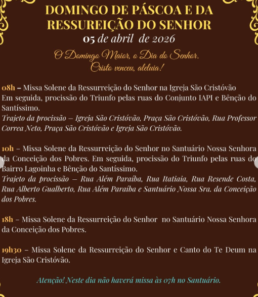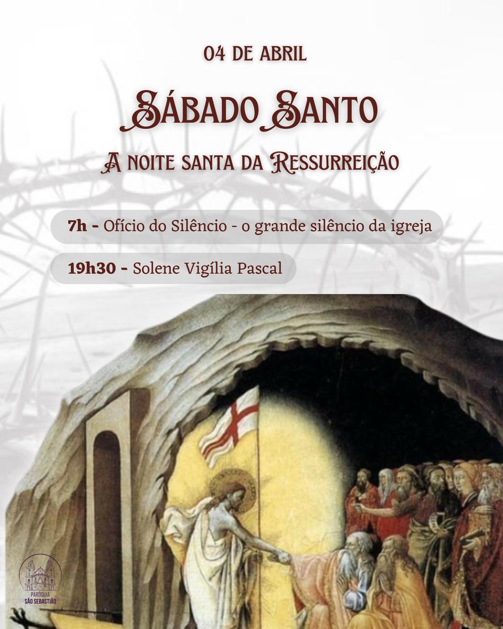19:30 – Celebração Eucarística na Comunidade Sagrado Coração de Jesus. Bênção do Fogo Novo em frente ao salão paroquial na (Avenida das Orquídeas) em seguida procissão a comunidade sagrado coração de Jesus e Acendimento do Círio Pascal e celebração dos catecúmenos (Batizado-Crisma-1ª Comunhão dos adultos)