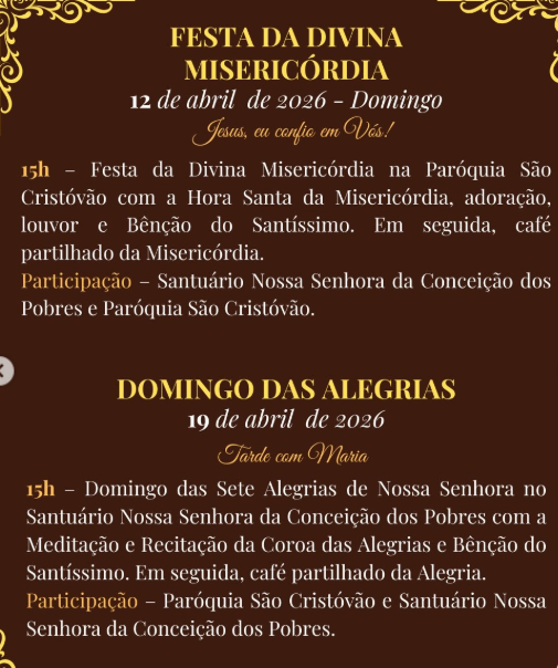 OBS: Caso chuvas todos acontecimentos são transferidos para Igreja da Comunidade Nossa Senhora de Fátima com início às 19:30)