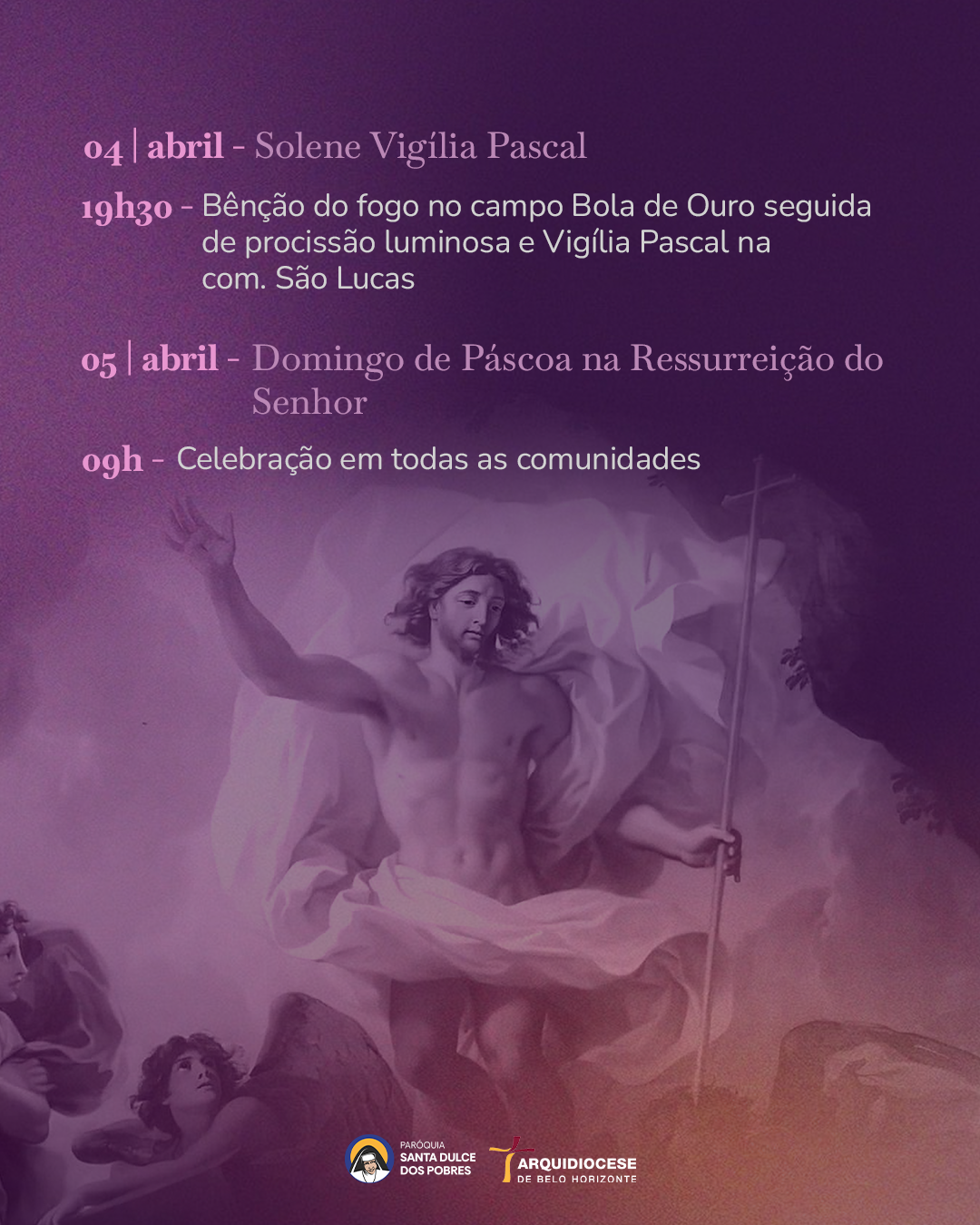 19h30min: Missa da Vigília Pascal – Comunidade Sagrado Coração de Jesus.