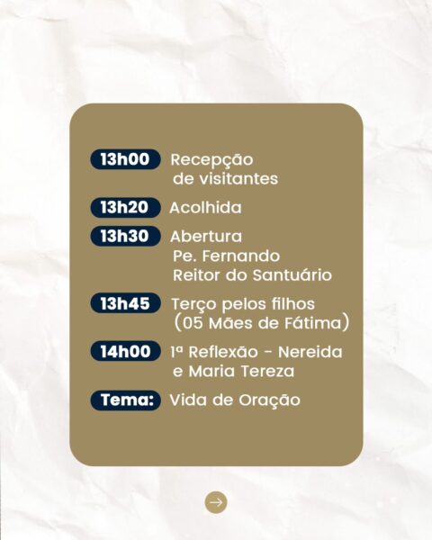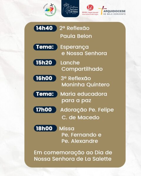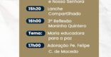 O encontro, que irá refletir sobre o chamado de Maria no Ano da Esperança, traz momentos de acolhida, oração do Terço pelos filhos, Missa e fraterna partilha de lanches entre os participantes.
