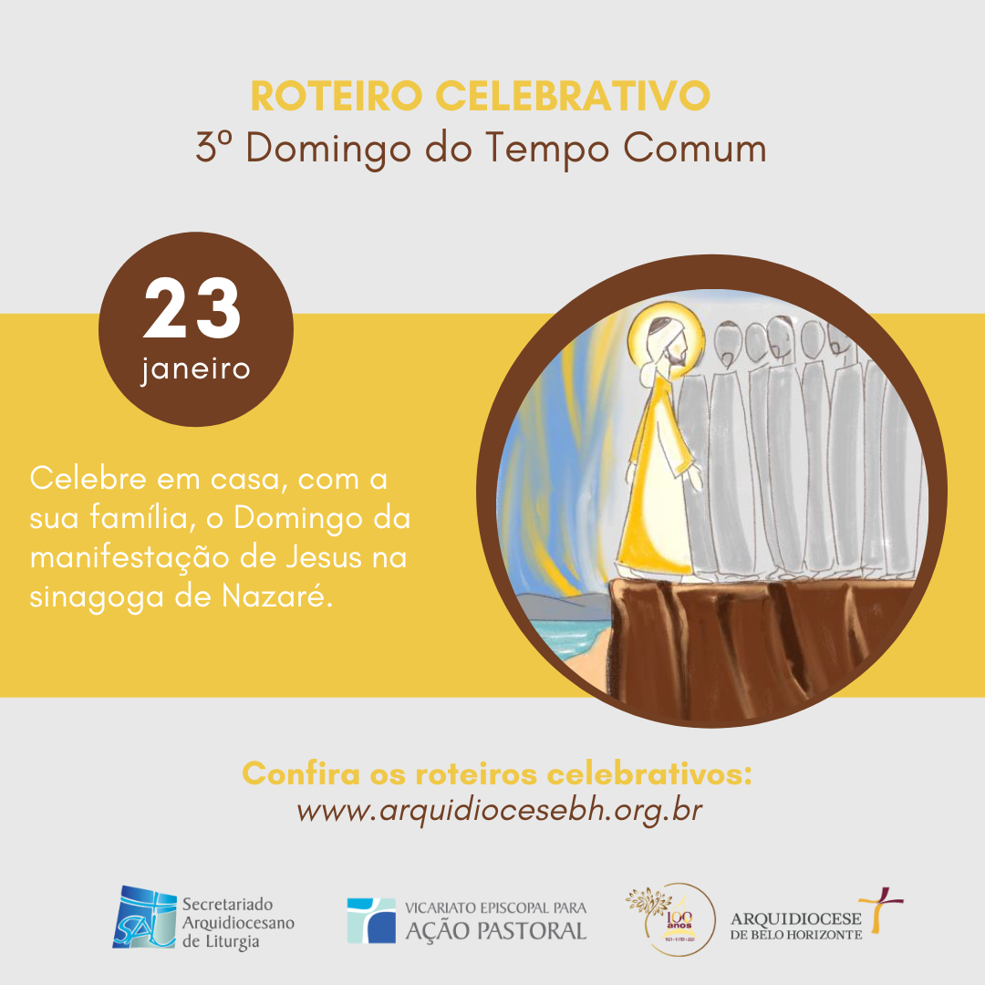 No dia 23 de janeiro, as comunidades de fé da Arquidiocese de Belo Horizonte celebram o 3º Domingo do Tempo Comum. Para  contribuir com as suas orações em casa, com a sua família, o Secretariado Arquidiocesano de Liturgia (SAL) disponibiliza o roteiro para celebrar o Domingo da manifestação de Jesus na sinagoga de Nazaré, produzido pela Irmã Penha Carpanedo, da Congregação Discípulas do Divino Mestre (Apostolado litúrgico), redatora da Revista de Liturgia e membro da Rede Celebra de animação litúrgica.