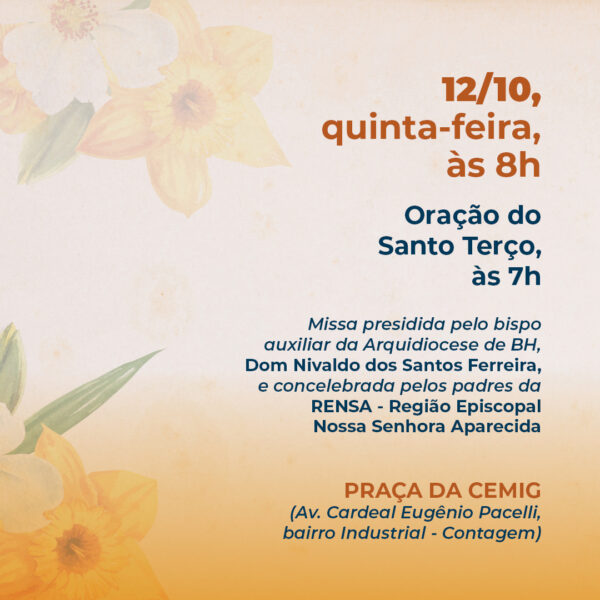 A tradicional Missa dedicada à Nossa Senhora Aparecida – Padroeira do Brasil – será celebrada, na Praça da Cemig, em Contagem, no dia 12 de outubro, quinta-feira, às 8h. A Missa será presidida por dom Nivaldo dos Santos Ferreira, bispo auxiliar da Arquidiocese de Belo Horizonte.