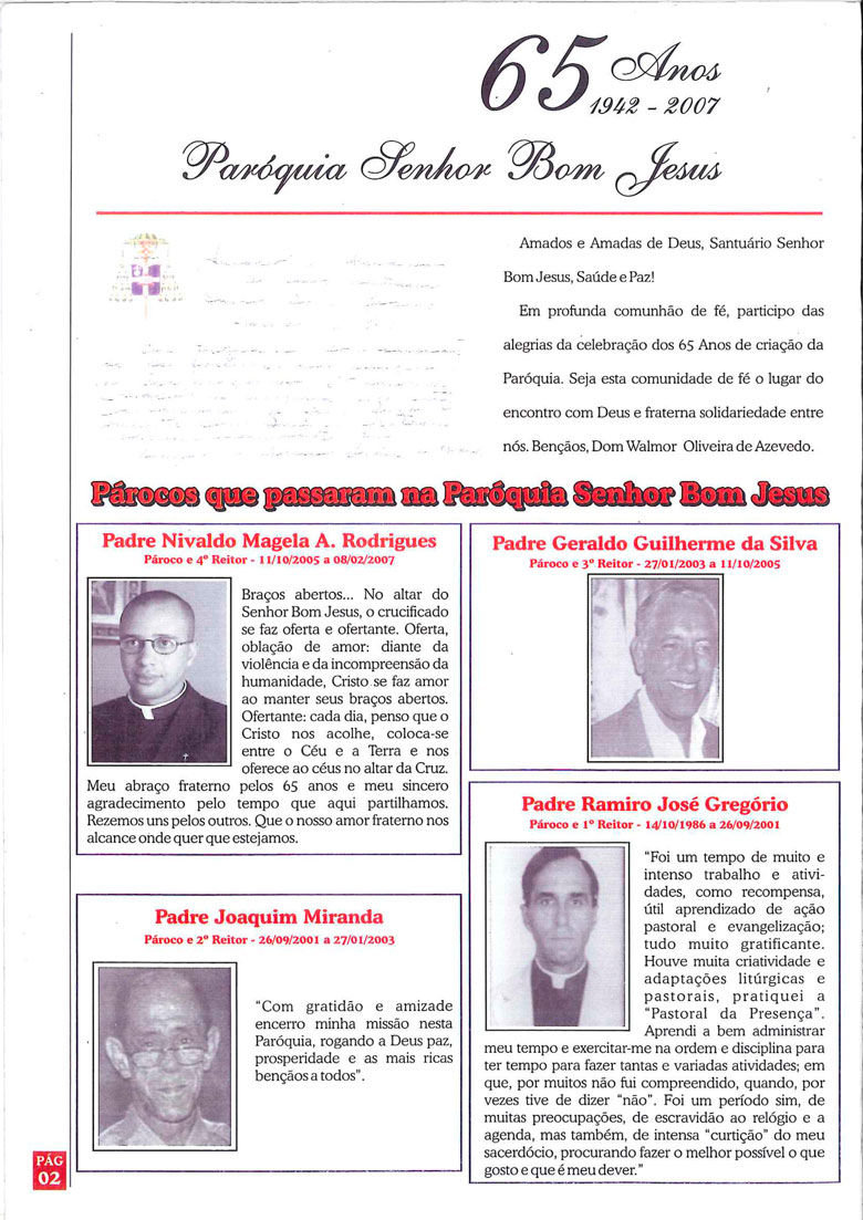 O primeiro pároco foi o Pe. Hélio Pereira Bahia que permaneceu por 1 ano sendo substituído por Pe. Valdemar Antônio de Pádua Teixeira. Em agosto de 1945 Pe. Armando de Marco foi nomeado vigário encarregado e em 31 de dezembro de 1946 Pe. Geraldo Matosinhos Pinto ocupou o cargo de vigário Ecônomo.