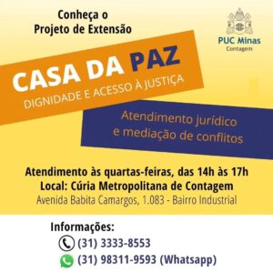 O projeto “Casa da Paz: dignidade e acesso à justiça”, que é desenvolvido pelo curso de Direito da Pontifícia Universidade Católica de Minas Gerais (PUC Minas), retoma a partir da próxima quarta-feira, 27 de agosto, com os atendimentos presenciais e virtuais gratuitos na Cúria Metropolitana da Região Episcopal Nossa Senhora Aparecida (Rensa), no bairro Jardim Industrial, em Contagem.