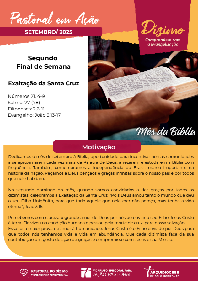 No mês da Bíblia celebre o Domingo do Dízimo na sua paróquia inspirados pela publicação “Pastoral em Ação”! O subsídio é produzido mensalmente pelo Vicariato Episcopal para Ação Pastoral (Veap) da Arquidiocese de Belo Horizonte, pela Pastoral do Dízimo e disponibilizado para as comunidades de fé.