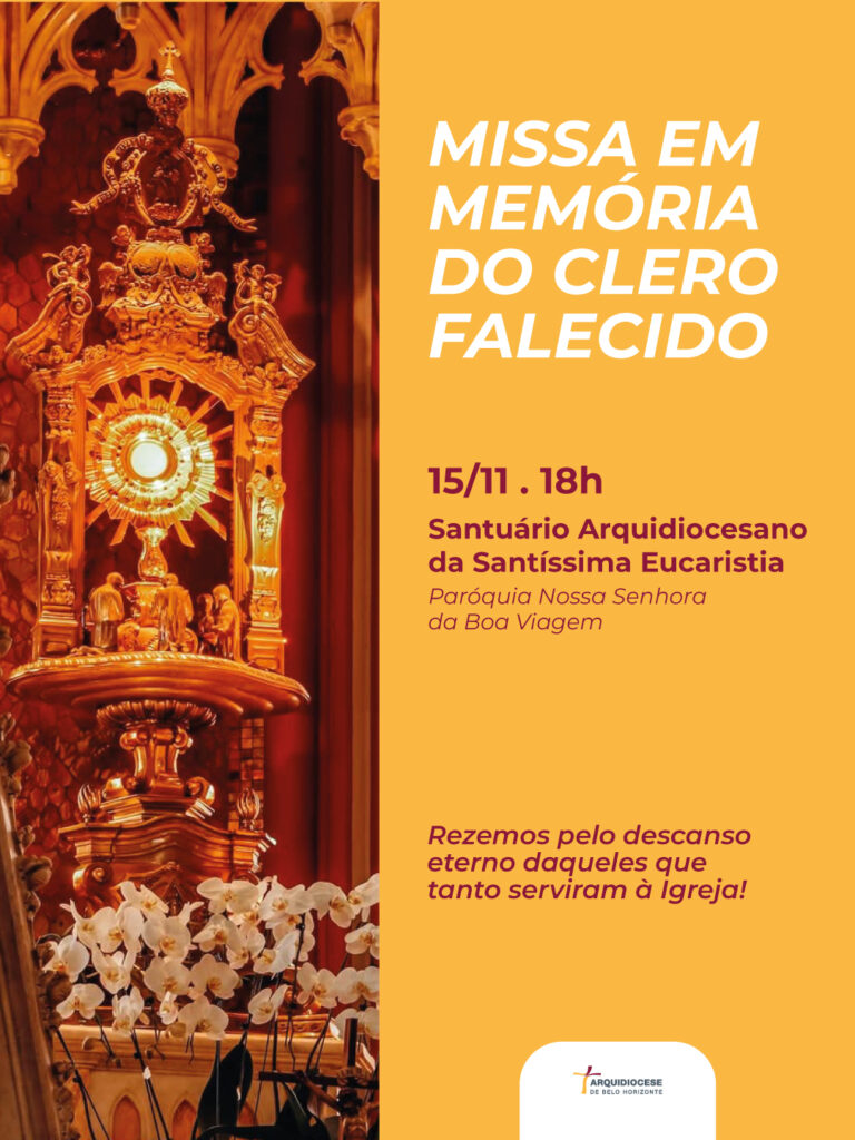 O Santuário Arquidiocesano da Santíssima Eucaristia – Paróquia Nossa Senhora da Boa Viagem – acolhe especial homenagem aos bispos, padres, diáconos e seminaristas já falecidos, neste sábado, 15 de novembro, com a celebração da Missa dedicada à memória do clero da nossa Arquidiocese, às 18h.
