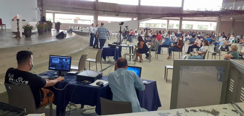 Dando continuidade Pe Filipe Gouvêa, membro da Comissão Arquidiocesana do Sínodo apresentou o cronograma da escuta na Arquidiocese de Belo Horizonte e os passos para o Sínodo sobre a sinodalidade na Igreja. A importância da divulgação do momento que estamos vivendo: assembleias paroquiais e consulta aberta a todo povo de Deus e pessoas de boa vontade por meio de formulário on-line. Ele disse que a comissão regional se reuniu e apresentou várias sugestões para a realização desta consulta. Encerrando o encontro, Dom Júlio César agradeceu a presença de mais 200 pessoas, entre padres, diáconos, irmãs e irmãos consagrados e evangelizadores representando as paróquias e finalizou presidindo a bênção do envio a todos os presentes. Vale ressaltar que o encontro foi transmitido pela Pascom/Rensc que brilhou na transmissão e fotos. Agradecimentos a toda equipe da Catedral Cristo Rei pelo apoio.