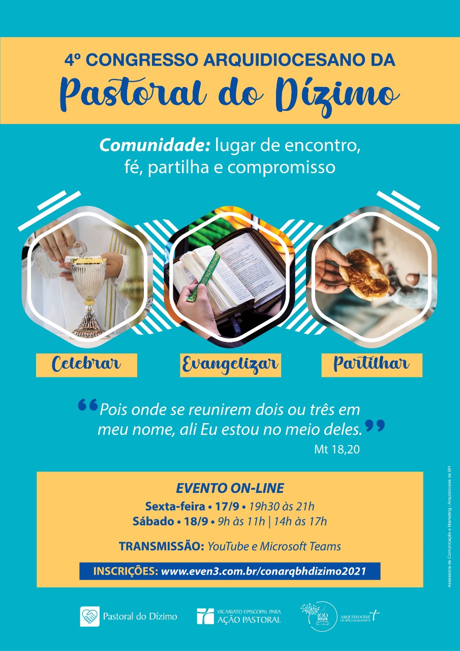 A Pastoral do Dízimo da Arquidiocese de Belo Horizonte promoverá o 4º Congresso Arquidiocesano da Pastoral do Dízimo na modalidade on-line. O evento será realizado por meio de palestras e oficina.