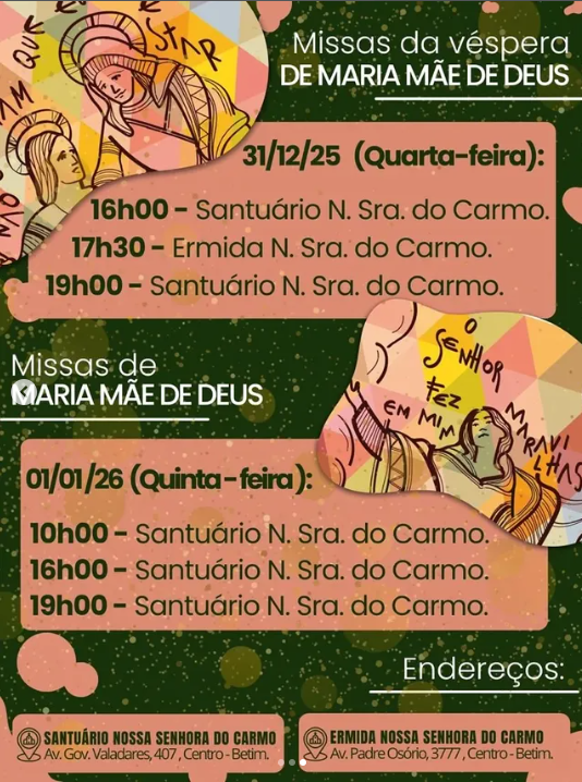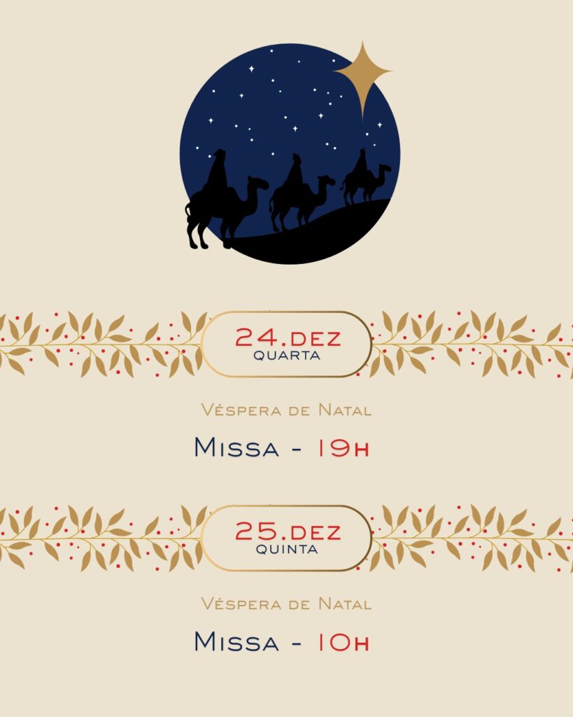 No dia 31 de dezembro, quarta-feira, a Missa de Véspera de Ano Novo será presidida às 19h30. Já no dia 1º de janeiro, a Celebração Eucarística de Santa Maria, Mãe de Deus, também será às 10h30. Acompanhe a programação, a seguir, e participe com sua família e amigos destes momentos especiais de comunhão e fé!🙏