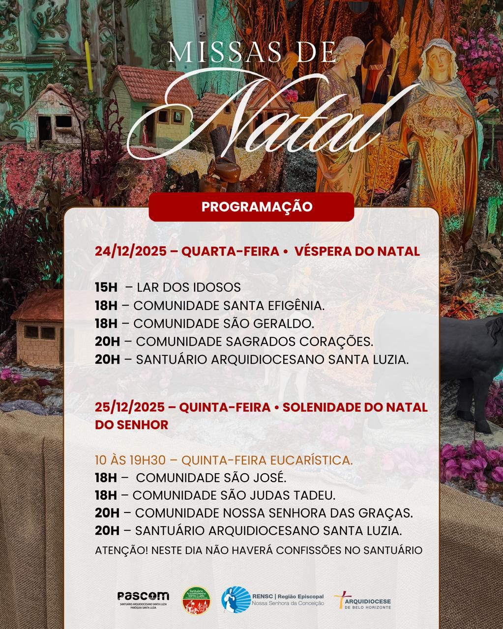 Inspiradas pelo Tempo do Natal e em preparação para o nascimento de Jesus, as comunidades de fé da Arquidiocese de Belo Horizonte convidam fiéis e suas famílias para programação especial de Natal e Ano-Novo que contempla cantatas, apresentações artísticas, novenas e Santa Missa, reunindo espiritualidade, cultura e fé.