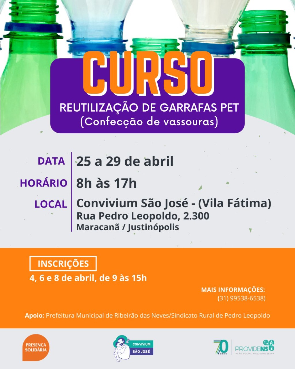 Estão abertas as inscrição para o Curso de Reutilização de Garrafas Pet para confecção de vassouras no Convivium São José, em Ribeirão das Neves.