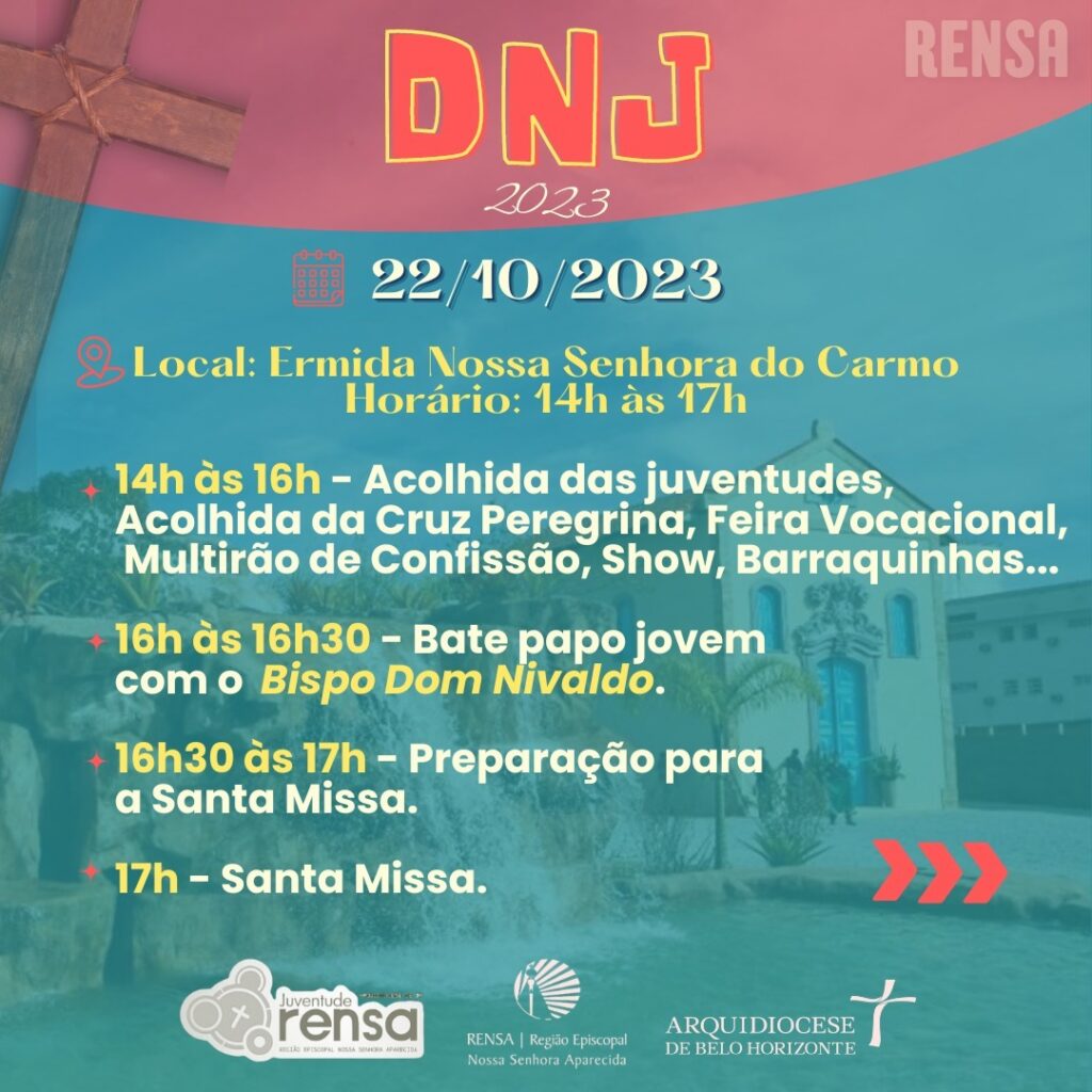 Na Região Episcopal Nossa Senhora Aparecida (Rensa), o DNJ será celebrado no domingo, dia 22 de outubro, das 14h às 17h, na Ermida Nossa Senhora do Carmo, em Betim. A programação especial convida as juventudes da Rensa a participarem de um bate-papo jovem com o bispo auxiliar da Arquidiocese de Belo Horizonte dom Nivaldo dos Santos Ferreira, além de atrações musicais, Santa Missa, mutirão de confissões e feira de profissões.