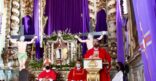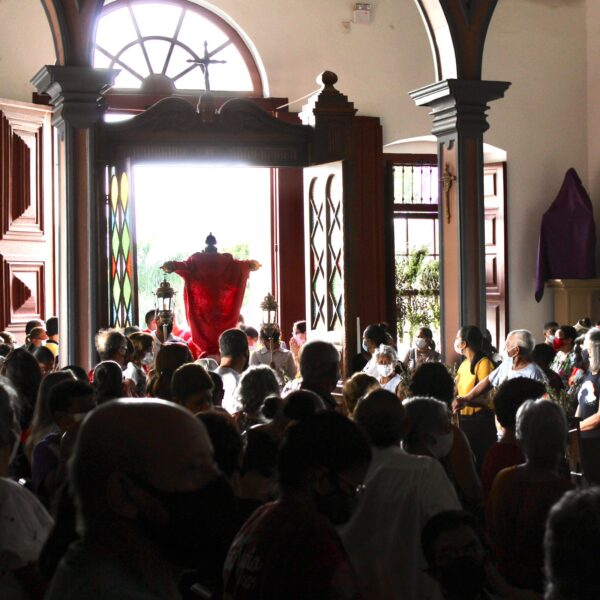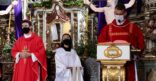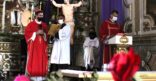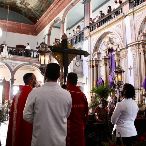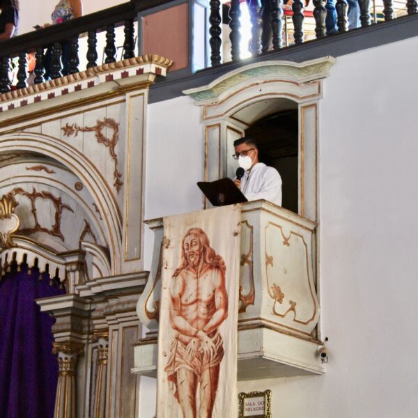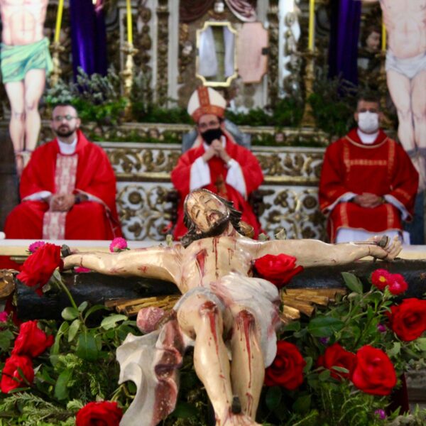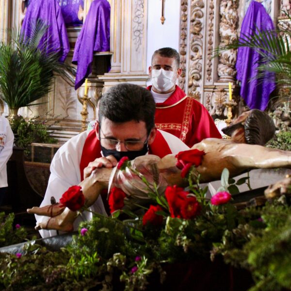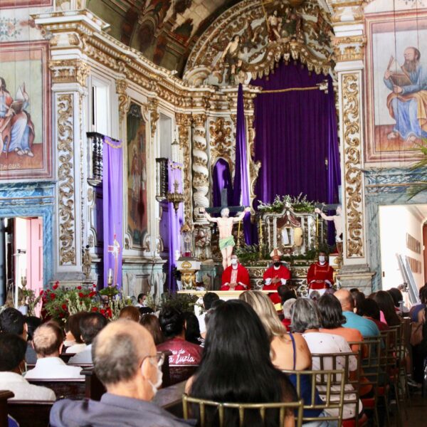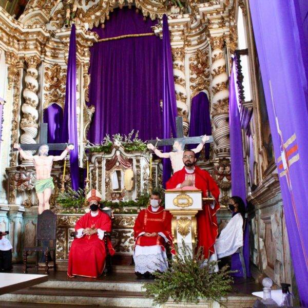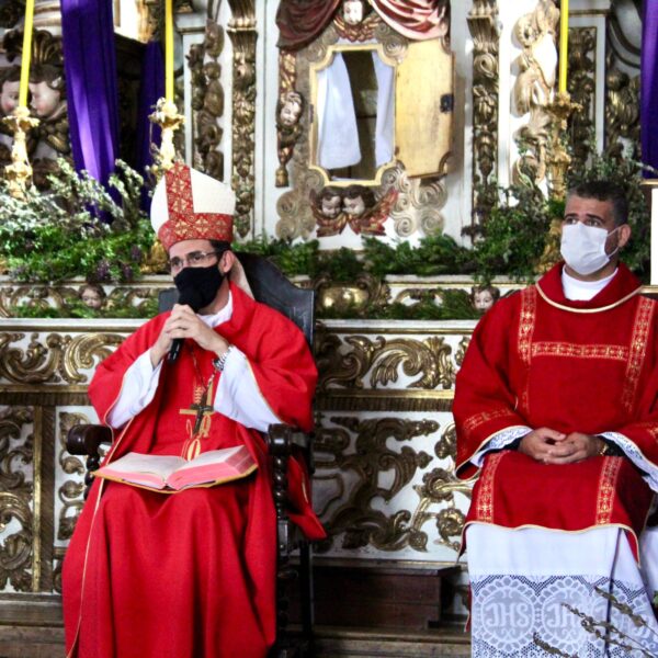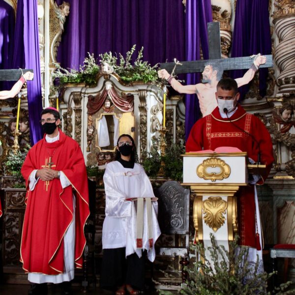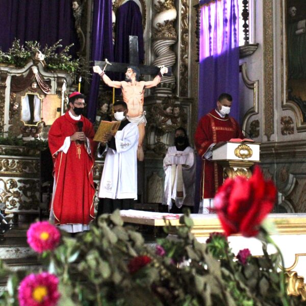 Dom Júlio César presidiu no Santuário Santa Luzia nesta Sexta-feira da Paixão – Ação Litúrgica Paixão e Morte de Jesus, com a proclamação da Palavra, a oração universal, a adoração da cruz e a distribuição da sagrada comunhão. A celebração foi concelebrada pelo Padre Felipe Lemos e com a participação do Diácono Júnior Luiz. Trecho da profunda reflexão de Dom Júlio César: “Nós somos chamados a ser valentes seguidores de Jesus. Não por nossa bondade. Ele é bom! Não por nossa justiça. Ele é justo! Mas bebemos e comemos na eucaristia da sua justiça e da sua inocência e do seu perdão. Recebemos nos sacramentos e a palavra dele na igreja proclama iluminando os nossos olhos, nos livrando das mentiras e das trevas. Valentes seguidores é o que o Senhor quer que a gente seja. Não gente frouxa que diante das primeiras dificuldades abandona Cristo e a sua igreja, porque hoje muitos seguidores querem Cristo, mas não querem a igreja dele, numa grande ilusão, pois é aqui onde ele nos salva, para iluminar e enviarmos a gente no meio do mundo. Não como gente superior, como gente melhor, mas como pecadores salvos e perdoados, como gente que tem a luz de Cristo crescendo vencendo aos poucos a escuridão. Vamos como testemunhas de uma vida nova que ele oferece para cada pessoa humana que se abre. Valentes seguidores, seguindo o valente guerreiro e que vai até as ultimas consequências na cruz, por amor de Deus, a seu Pai, por amor de nós, seu povo, seus amigos e seus seguidores. O Senhor nós ama! Não tenhamos vergonha da Cruz. Assumido a nossa cruz que ele oferece não como peso, mas como participação na sua vitória, como participação no seu amor, como participação na sua sabedoria, para não deixar nos enganar pelas falsas doutrinas do mundo que nos iludem. Nós temos alguém por nós o Filho de Deus. Aproximamos dele, do trono da graça que é a sua cruz! Que se nos tornou para nós porta, que se tornou para nós arvore da vida. Ele nunca nos dá uma cruz sem que ele esteja junto. E assim pode deixar aos olhos do mundo o mistério do amor, de liberdade, de vida mais forte que a morte. De amor mais forte que ódio.”