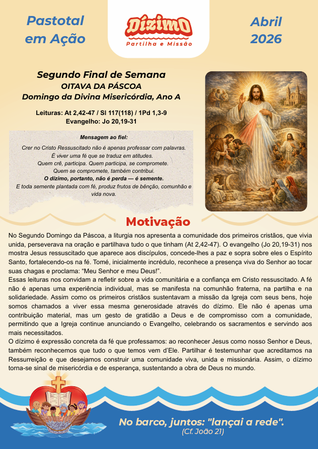 Celebre o Domingo do Dízimo na sua paróquia com o auxílio da publicação “Pastoral em Ação”! A edição de abril nos convida a recordar que “Crer no Cristo Ressuscitado não é apenas professar com palavras. É viver uma fé que se traduz em atitudes”.