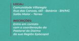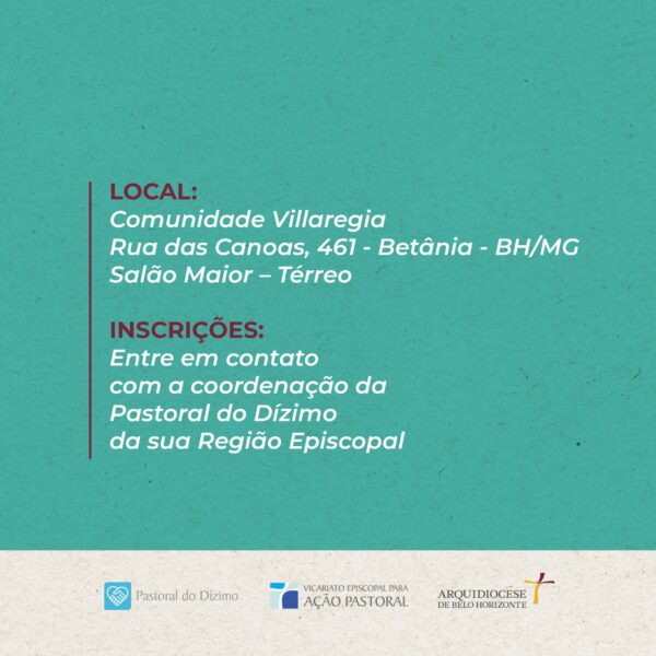 A Pastoral do Dízimo da Arquidiocese de Belo Horizonte convida vigários regionais e forâneos, assessores eclesiais e leigos coordenadores regionais e forâneos para o Encontro de Espiritualidade e Formação para Lideranças da Pastoral do Dízimo. O momento formativo será realizado no dia 25 de março, das 8h às 17h, na Comunidade Villaregia, bairro Betânia.