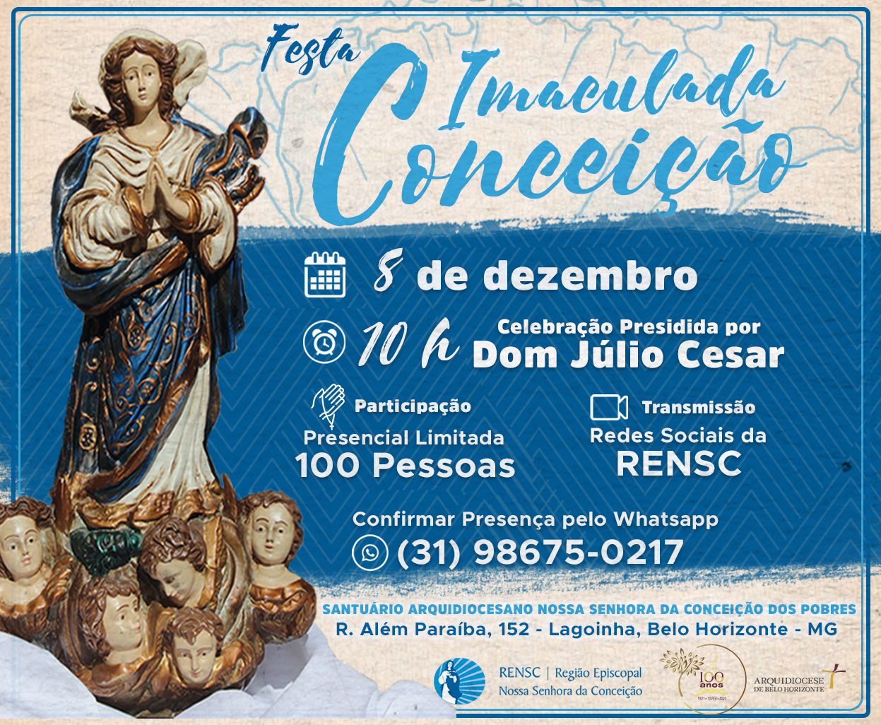 Festa da padroeira da Região Episcopal Nossa Senhora da ConceiçãoOuça o conteúdo 0.5x 1.0x 1.5x 2.0x 29/11/2021Festa da padroeira da Região Episcopal Nossa Senhora da Conceição. Dia 08 de dezembro, 10h, celebração presidida pelo Dom Júlio César, bispo auxiliar da Arquidiocese de Belo Horizonte. Acompanhe pelas nossas redes sociais. /RENSC /RENSC