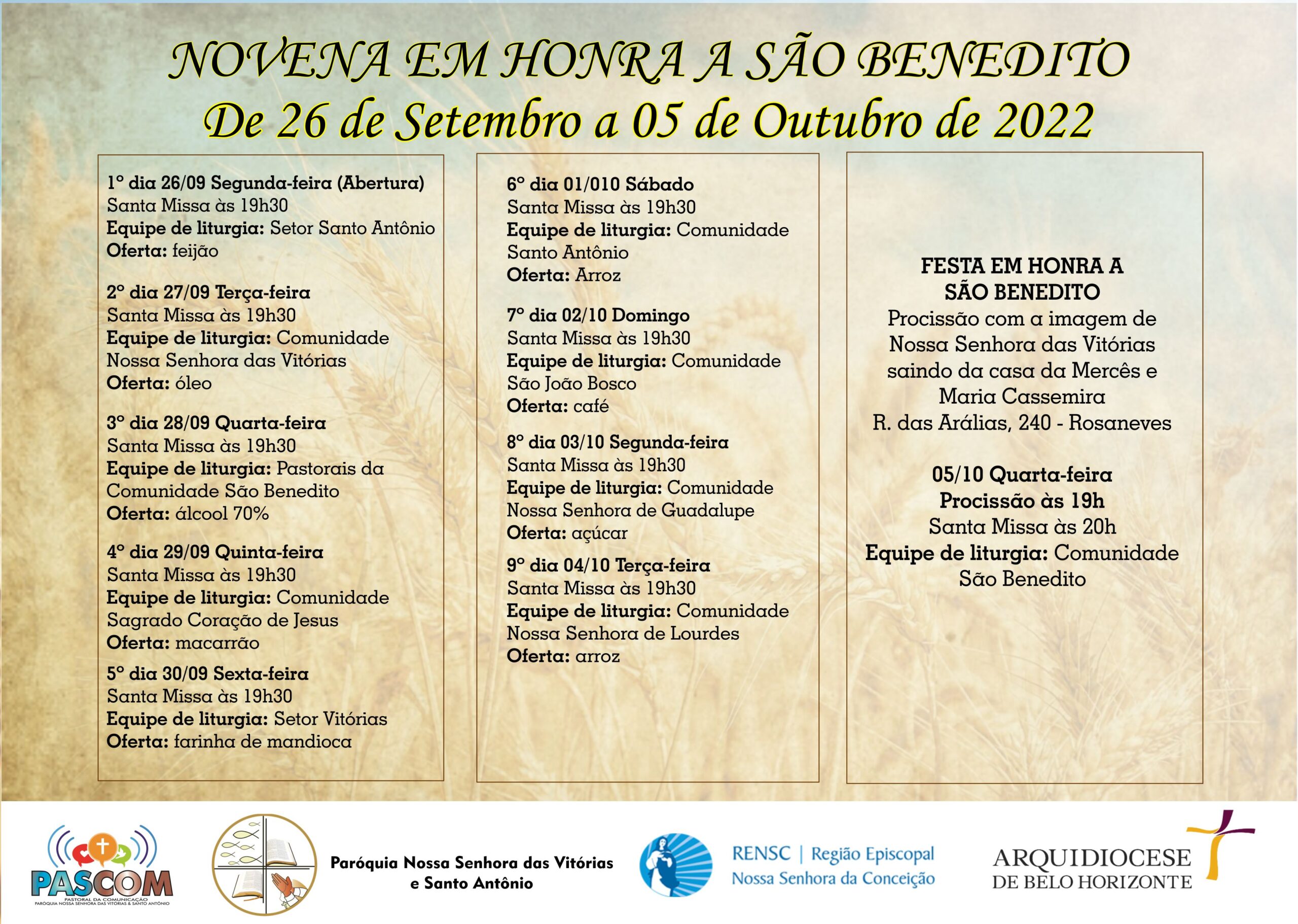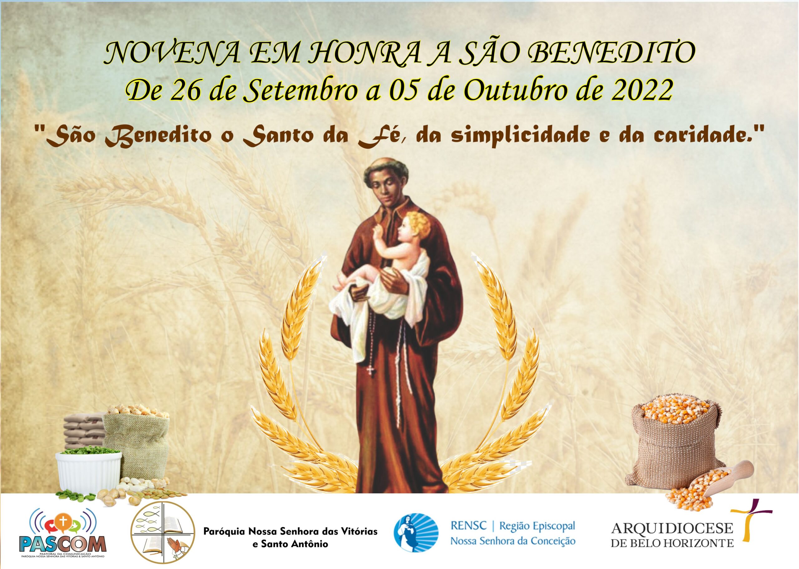 Festa de São BeneditoOuça o conteúdo 0.5x 1.0x 1.5x 2.0x Noticias 19/09/2022A Paróquia Nossa Senhora das Vitórias e Santo Antônio – Ribeirão das Neves. convida para Novena em Honra a São Benedito.