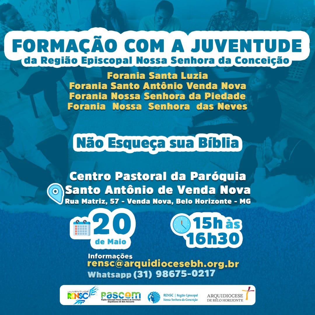 E às 15h, formação com as juventudes das Foranias Santo Antônio de Venda Nova, Nossa Senhora da Piedade, Nossa Senhora das Neves e Santa Luzia