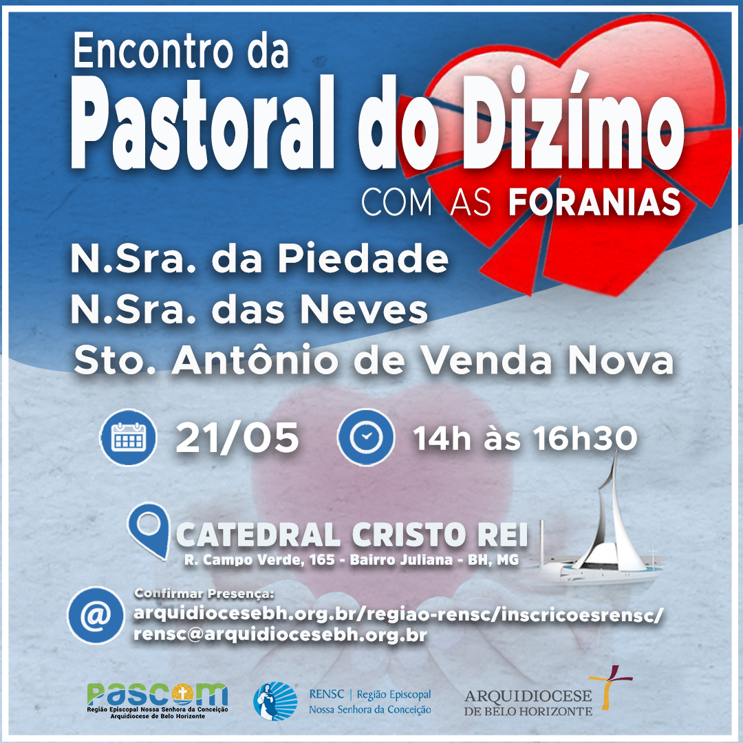 Colegiado do Dízimo da Região Episcopal Nossa Senhora da Conceição promove no próximo sábado, dia 21 de maio, de 14h às 16h30 um encontro de formação para as paróquias pertencentes as Foranias Nossa Senhora das Neves, Nossa Senhora da Piedade e Santo Antônio de Venda Nova. Local: Catedral Cristo Rei – Rua Campo Verde, 165 – bairro Juliana – confirme presença através do link. https://arquidiocesebh.org.br/regiao-rensc/inscricoesrensc/ ou pelo whastApp 98675-0217 Rensc.