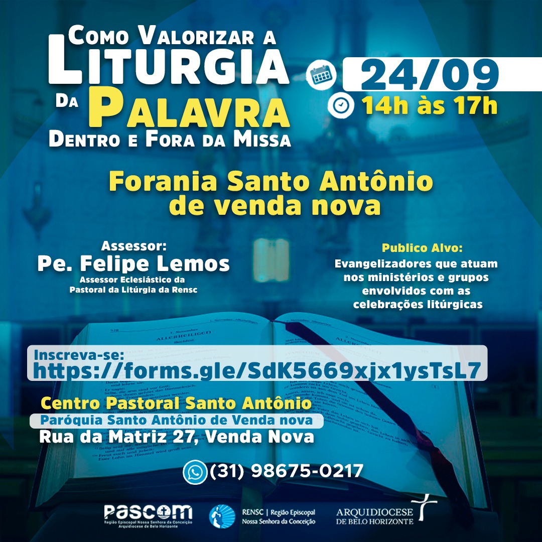 A Equipe Regional de Liturgia da Região Episcopal Nossa Senhora da Conceição promoverá um encontro de formação para equipes de Liturgias das paróquias pertencentes à Forania Santo Antônio de Venda Nova.