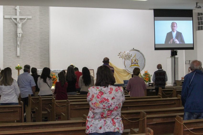 Pe. Januário iniciou a celebração dizendo que quando adentrava na igreja, junto com Pe. Antônio Moacir viu nitidamente duas famílias, a família de Monsenhor João Batista e seus entes queridos, e a família da Paróquia N Sra. da Paz, a família de coração também de Monsenhor João. E completou dizendo que aqui viemos celebrar ação de graças, gratidão e contemplação. Em seguida foi apresentado um vídeo de Dom Walmor, que não pode estar presente. Segue um trecho desta mensagem; “O evangelho nos apresenta quem é o bom pastor, Jesus, que dá vida por suas ovelhas. A exemplaridade de Cristo é uma convocação para cada pessoa, para dedicar a própria vida ao bem do próximo, somos ovelhas sobre o pastoreio de Cristo, mas também recebemos a missão de ser pastores uns dos outros e de cuidarmos uns dos outros. Celebrar a memória do Monsenhor João Batista Assunção é oportunidade para reverenciar o exemplo de quem seguiu com fidelidade o Cristo bom Pastor.