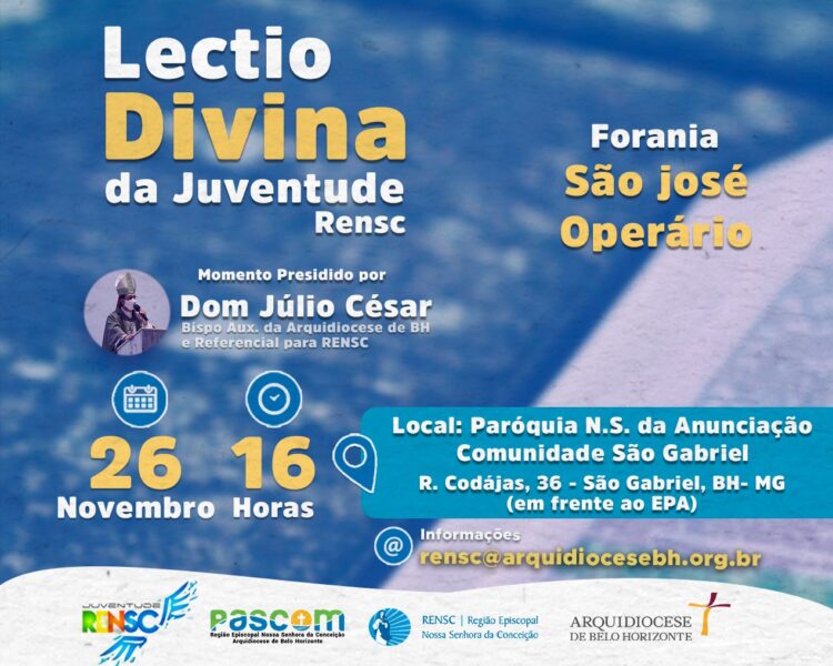 Próximo sábado, dia 26 de novembro, às 16h, momento orante com Dom Júlio César, bispo auxiliar da Arquidiocese de Belo Horizonte e referencial para Região Episcopal Nossa Senhora da Conceição.