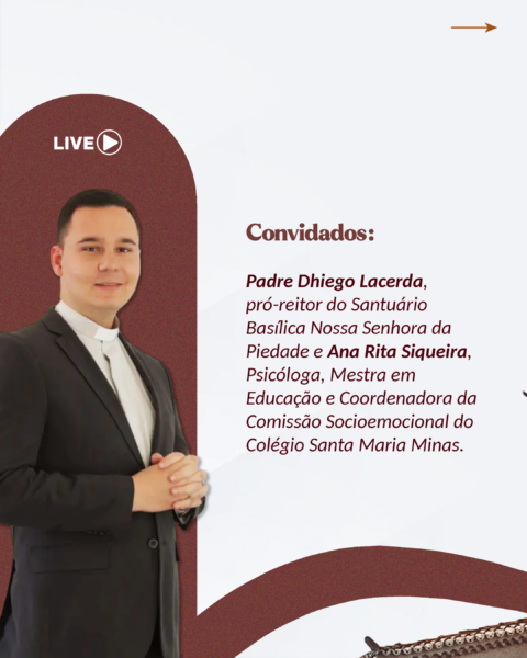 Participe conosco desse bate-papo especial, no dia 24 abril, quarta-feira,  às 20h, pelo canal Mãe Piedade no YouTube e Facebook. A live vai contar com as ricas reflexões do padre Dhiego Lacerda , pró-reitor do Santuário Basílica Nossa Senhora da Piedade e da Ana Rita Siqueira psicóloga, mestra em educação e coordenadora da Comissão Socioemocional do Colégio Santa Maria Minas.