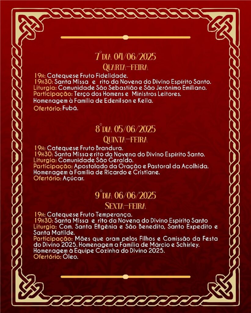 - 18h – Santa Missa: “Os Sete Dons: Sabedoria, Entendimento, Conselho, Fortaleza, Ciência, Piedade e Temor de Deus.”
