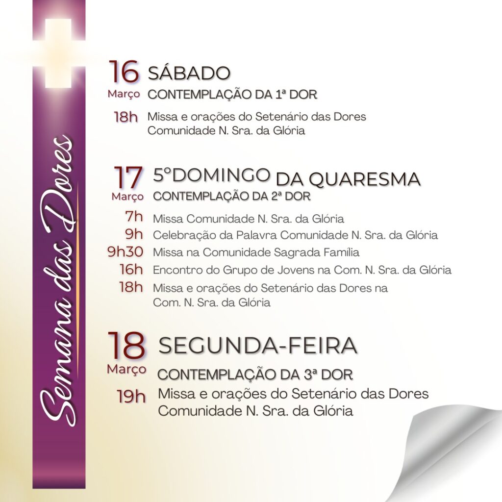 OBS: durante a Semana das Dores, não haverá Missas, nas outras comunidades, como também no Sábado que antecede o Domingo de Ramos.