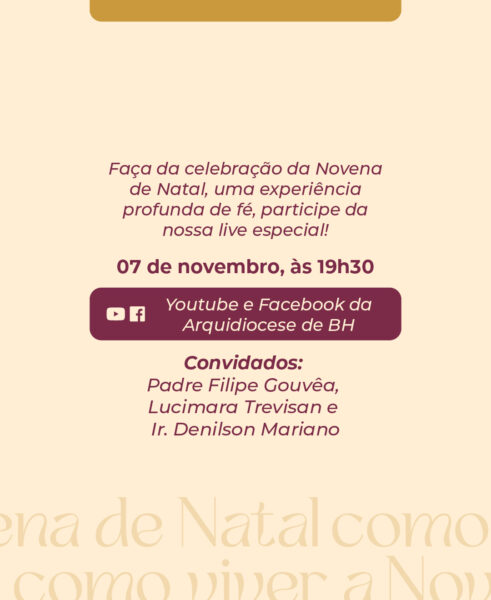 Em preparação para o Nascimento de Jesus, convidamos você para participar da live “Renove sua fé: como viver a Novena de Natal”, no dia 7 de novembro, quinta-feira, às 19h30, pelo canal da Arquidiocese de BH, no YouTube e Facebook.?