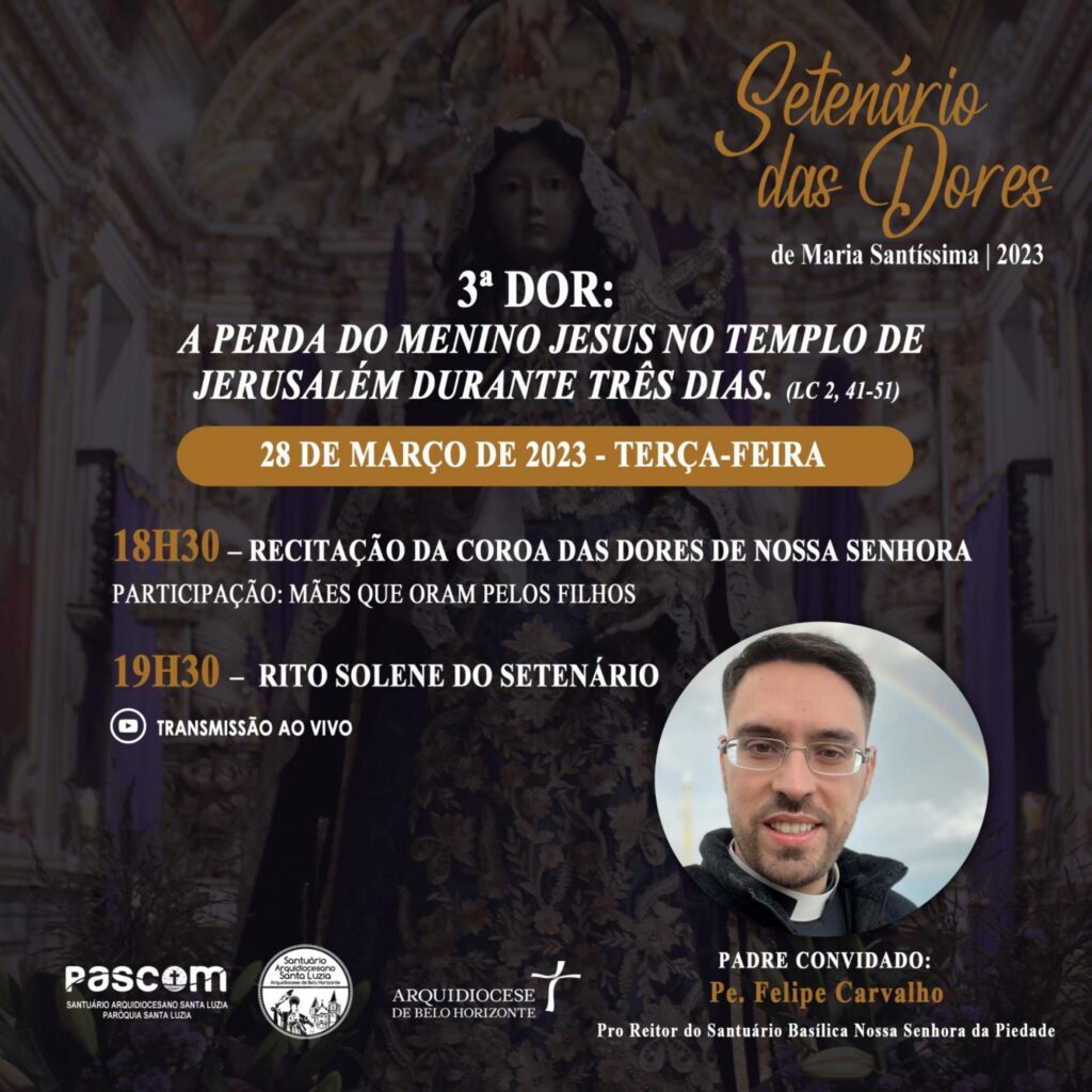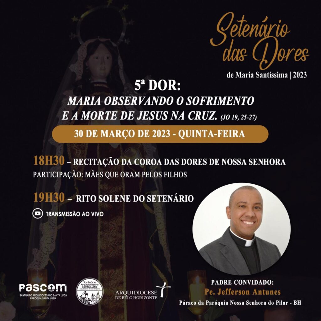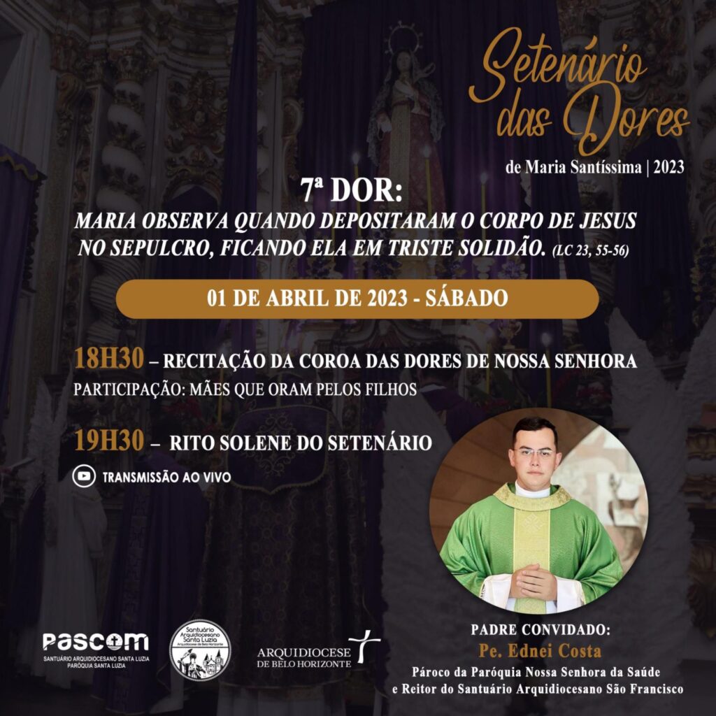 As comunidades de fé da Arquidiocese de Belo Horizonte convidam fiéis para vivência do Setenário das Dores de Maria, com momentos de meditação e oração em preparação para a Semana Santa. Os encontros acontecem a partir de 24 de março a 1 de abril.