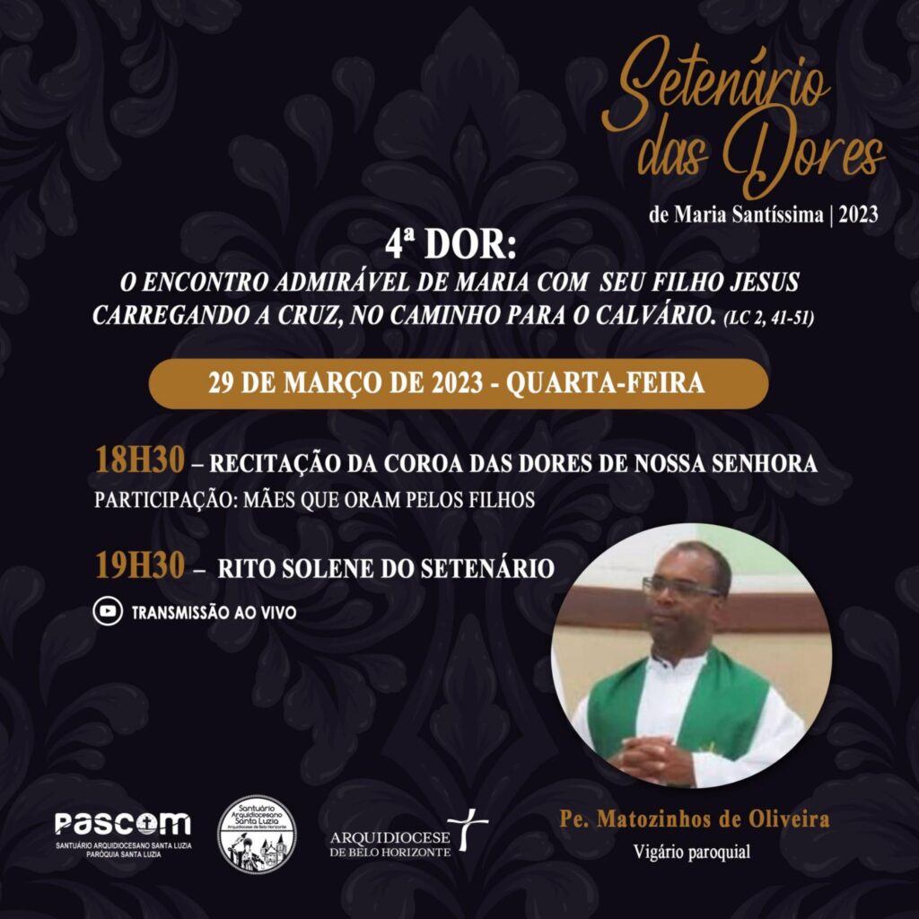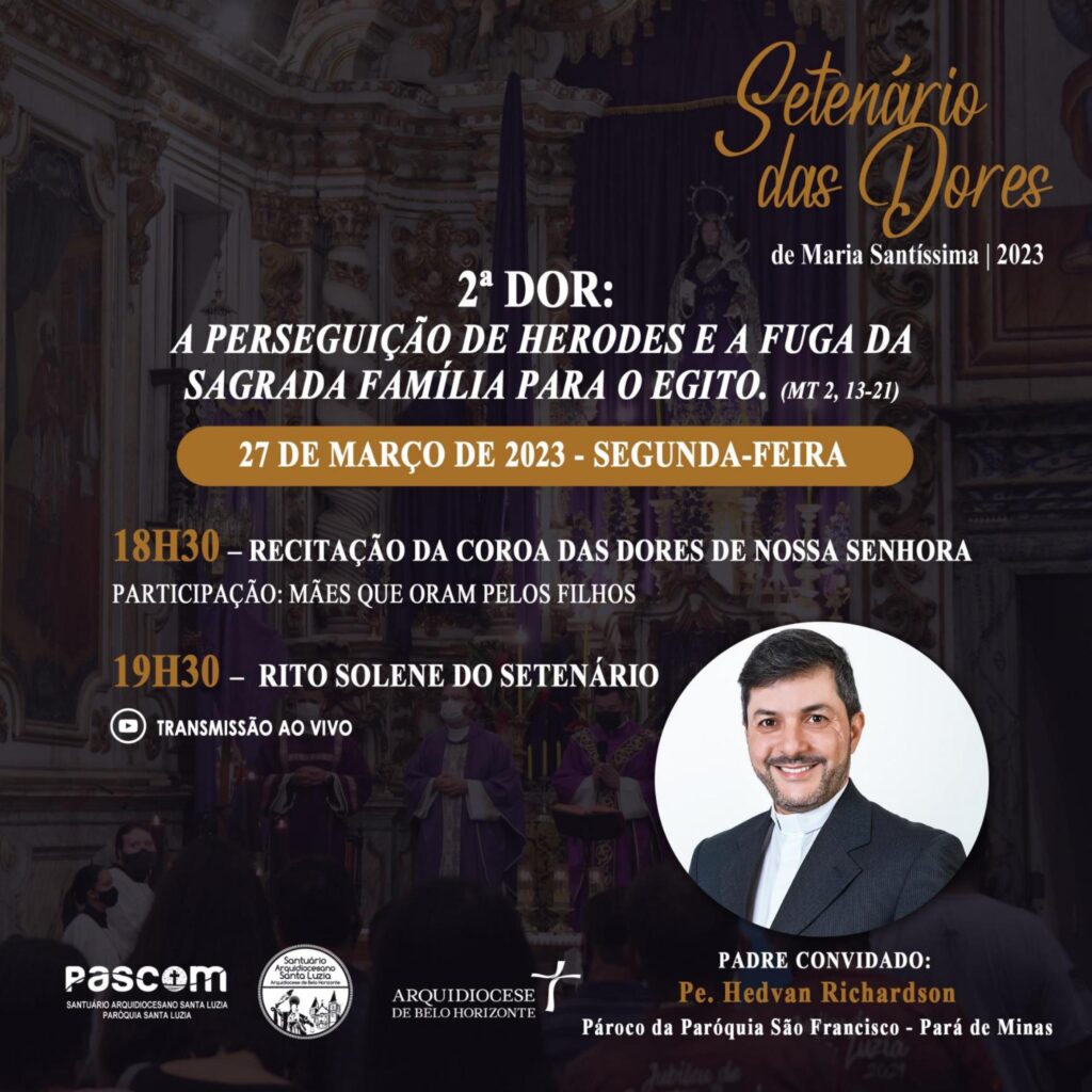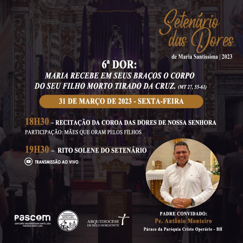 As comunidades de fé da Arquidiocese de Belo Horizonte convidam fiéis para vivência do Setenário das Dores de Maria, com momentos de meditação e oração em preparação para a Semana Santa. Os encontros acontecem a partir de 24 de março a 1 de abril.