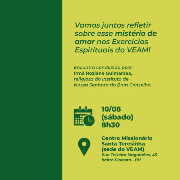 Vicariato Episcopal para Ação Missionária (Veam) da Arquidiocese de Belo Horizonte convida fiéis e comunidades de fé para participarem dos  encontros de Exercícios Espirituais 2024 sobre os períodos do ano litúrgico da Igreja, no Centro Missionário Santa Teresinha (sede do Veam). O quarto encontro propõe reflexão sobre o Tempo Comum e ocorre no dia 10 de agosto, sábado, a partir das 8h30.