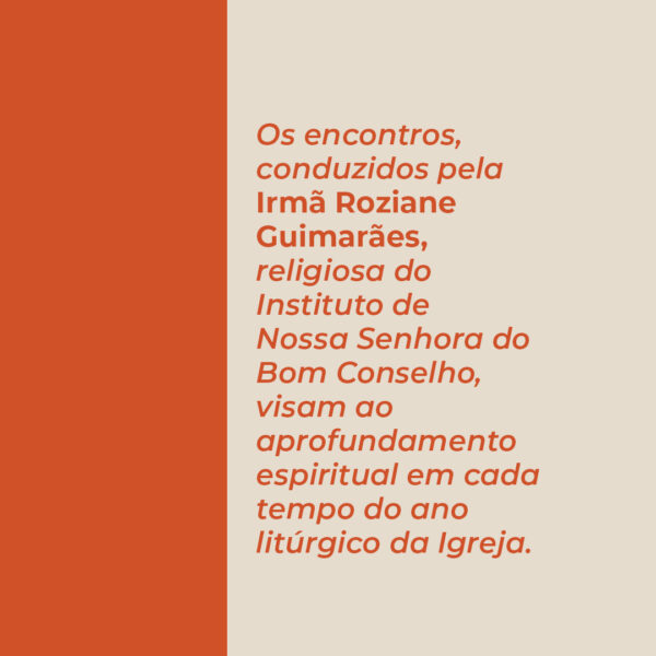 O terceiro encontro sobre a Solenidade de Pentecostes acontece no dia 18 de maio, sábado, a partir das 8h30. O encontro formativo será conduzido pela Irmã Roziane Guimarães, religiosa do Instituto de Nossa Senhora do Bom Conselho. A formação, que é gratuita, visa contribuir com o aprofundamento espiritual cotidiano dos leigos e leigas e dos agentes de pastoral, possibilitando que a voz e os sinais do Espírito Santo sejam ressoados no silêncio do coração de cada pessoa a partir da oração e do discernimento pessoal.