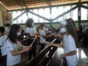 Daqui a pouco, quando o padre oferecer a vocês o Corpo de Cristo, vocês irão responder “Amém!”, na certeza de que ali não é mais o pão sem fermento, feito de água e trigo, mas será o Corpo de Cristo. É claro que não é algo orgânico, não é carne precisamente; mas é o Corpo de Cristo. E é a nossa fé que vai dizer isso. Da mesma forma que você não vê o amor, mas o traduz através de gestos; assim vai acontecer quando cada um receber o Corpo e Sangue do Senhor e este alimento irá se tornar uma verdadeira graça para nós. Desse modo, cada criança e adolescente aqui presente que irá receber o Corpo e o Sangue de Cristo pela primeira vez irá fazer memória do mandamento de Jesus: “Amai-vos uns aos outros como eu vos amei”. A partir do momento que comungamos o Corpo do Senhor, a nossa vida também se configura em Cristo. Ao comungar, estamos entregando a nossa vida para Jesus. Assim, as suas e as nossas atitudes devem ser de paciência, de perdão, de caridade, de religiosidade, etc.
